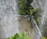 进入另一个展厅,一股冷流扑了过来,冻得我们直发抖,好像一下子进入了冬季。前面有水花溅起,一条十米长的大瀑布竟挂在了树上!围着这棵超级大树有一座吊桥晃来晃去,走在上面,就像在树顶漫步,那感觉真奇妙!