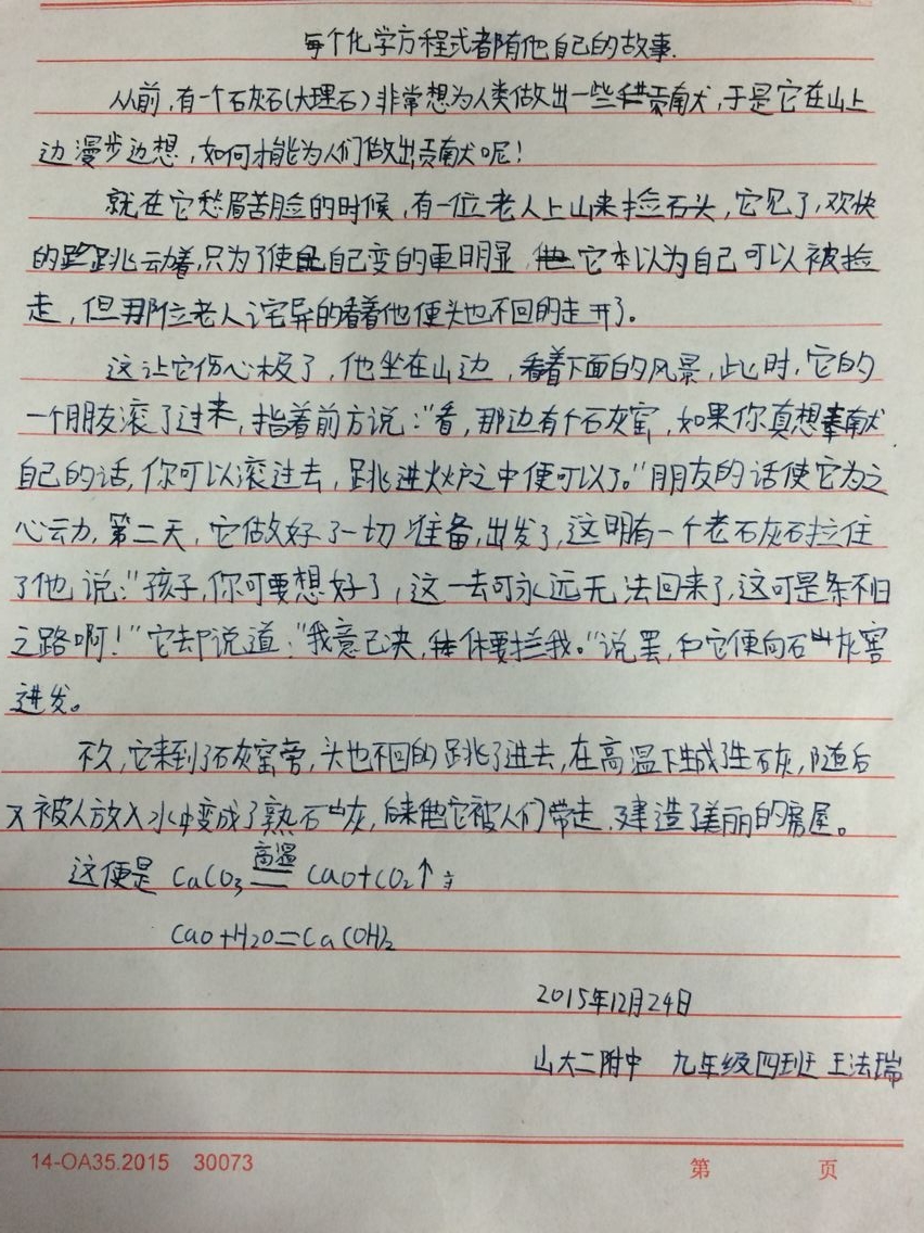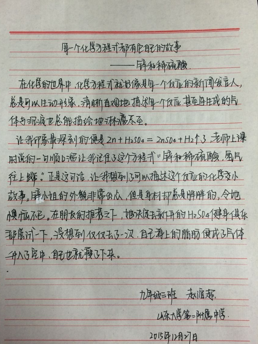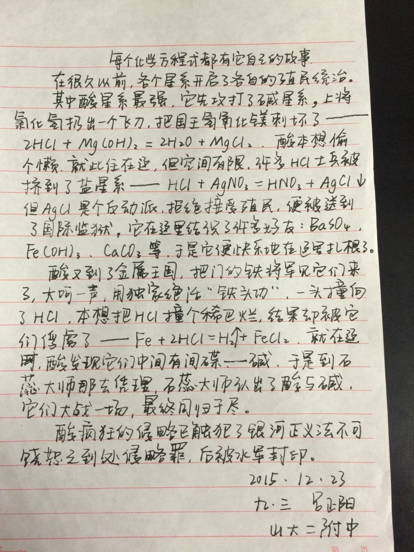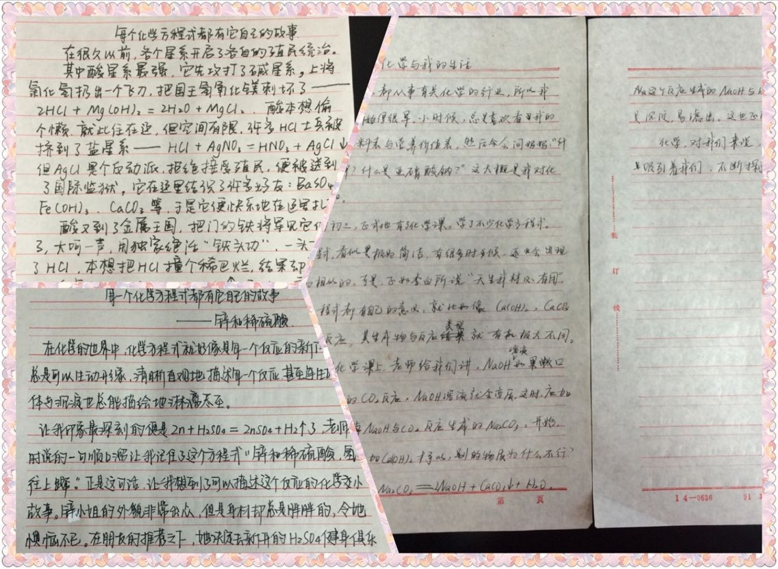化学方程式是化学基础知识的最重要组成部分,是老师向学生传播化学知识的媒介,是学生掌握化学知识必不可少的工具。为了让学生们能更好的的掌握这样工具。我们举办了一次主题为“每个化学方程式都有它自己的故事”的征文活动。