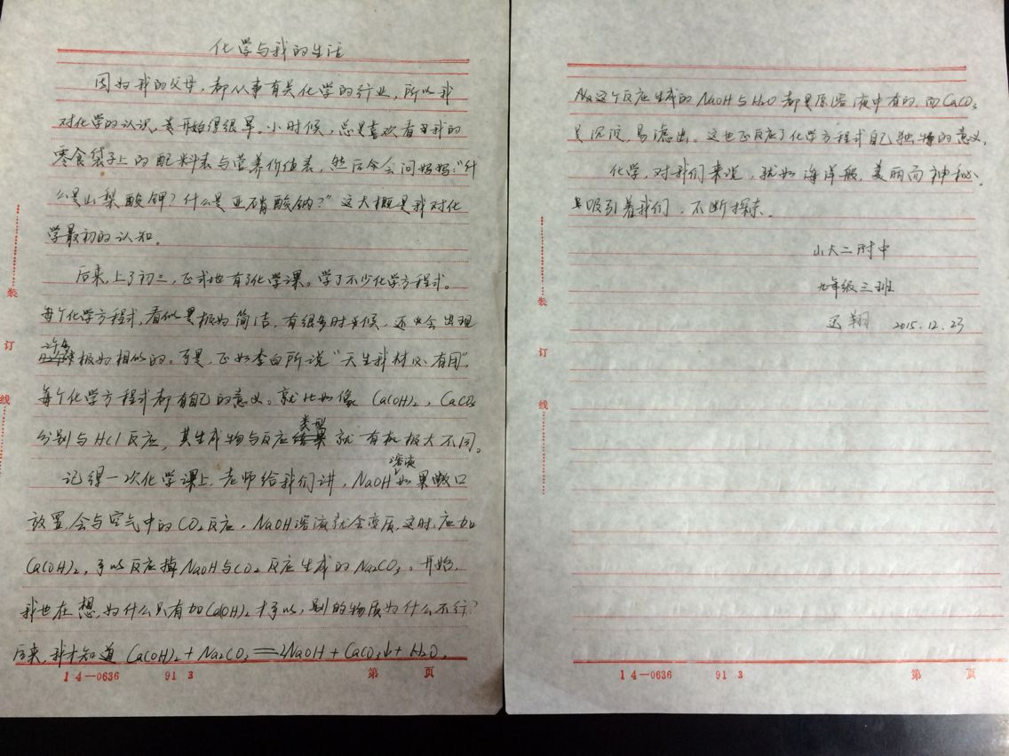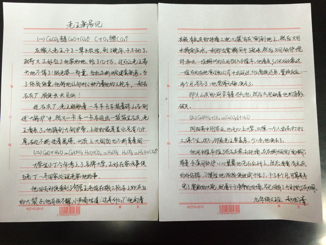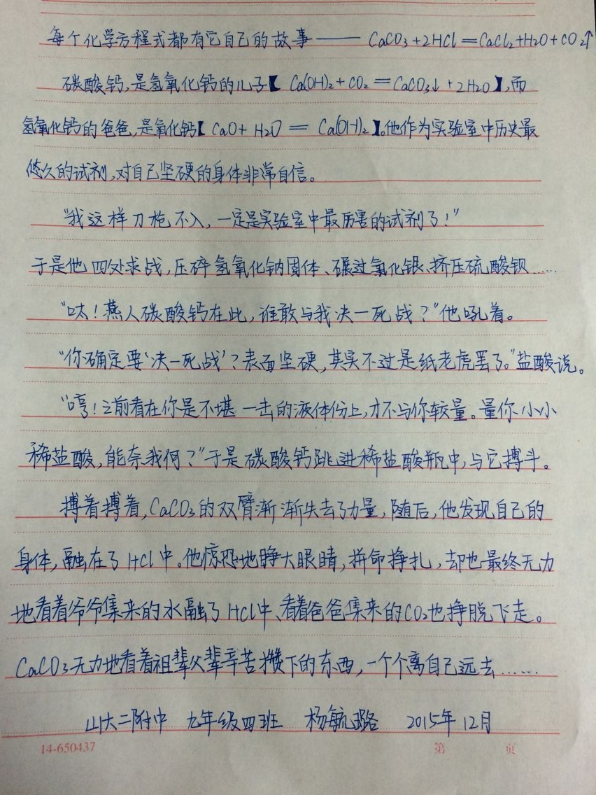 化学方程式是化学基础知识的最重要组成部分,是老师向学生传播化学知识的媒介,是学生掌握化学知识必不可少的工具。为了让学生们能更好的的掌握这样工具。我们举办了一次主题为“每个化学方程式都有它自己的故事”的征文活动。