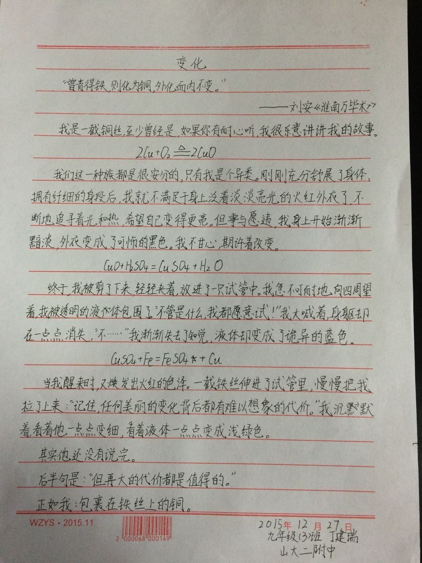 丁建瑞同学的征文《变化》,笔锋细腻,对涉及到的化学方程式表达的淋淋尽致,就连每个符号都是有故事的。在他的文章中我们不难看出,丁建瑞同学绝不是个“简单的理科男”,更是个风趣有内涵的理科男。