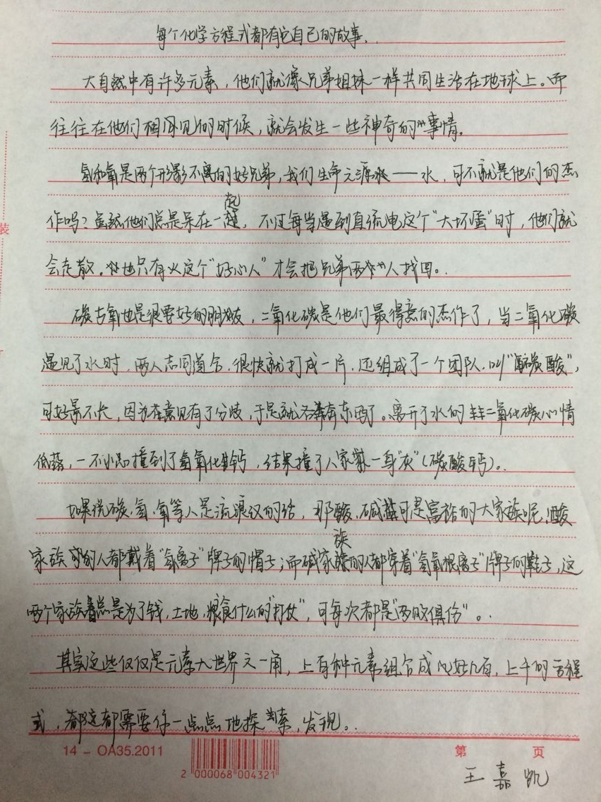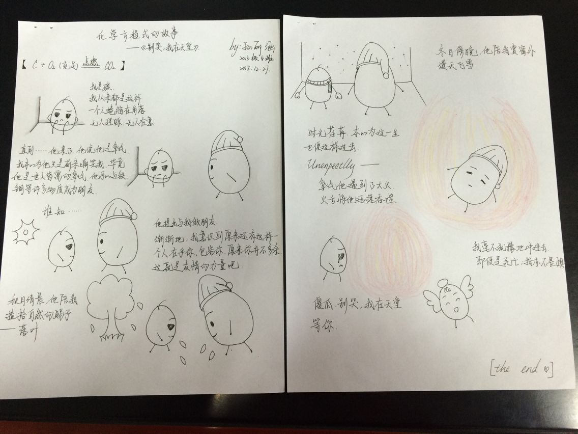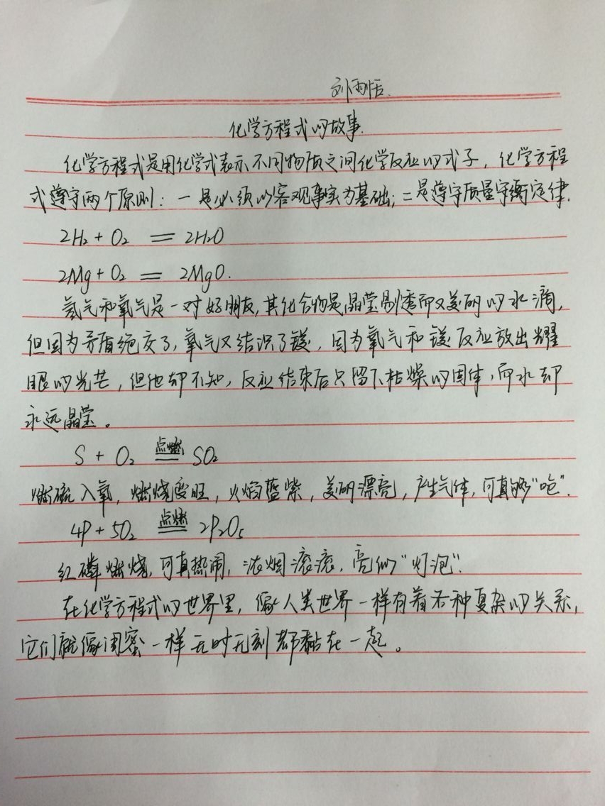 孙丽涵同学的征文《化学方程式的故事---别哭,我在天堂》,活泼可爱,图文并茂地描述了整个化学变化过程。不用接触,我们也能感觉到孙丽涵同学的热情开朗,这一定是一个聪明伶俐的女孩子。