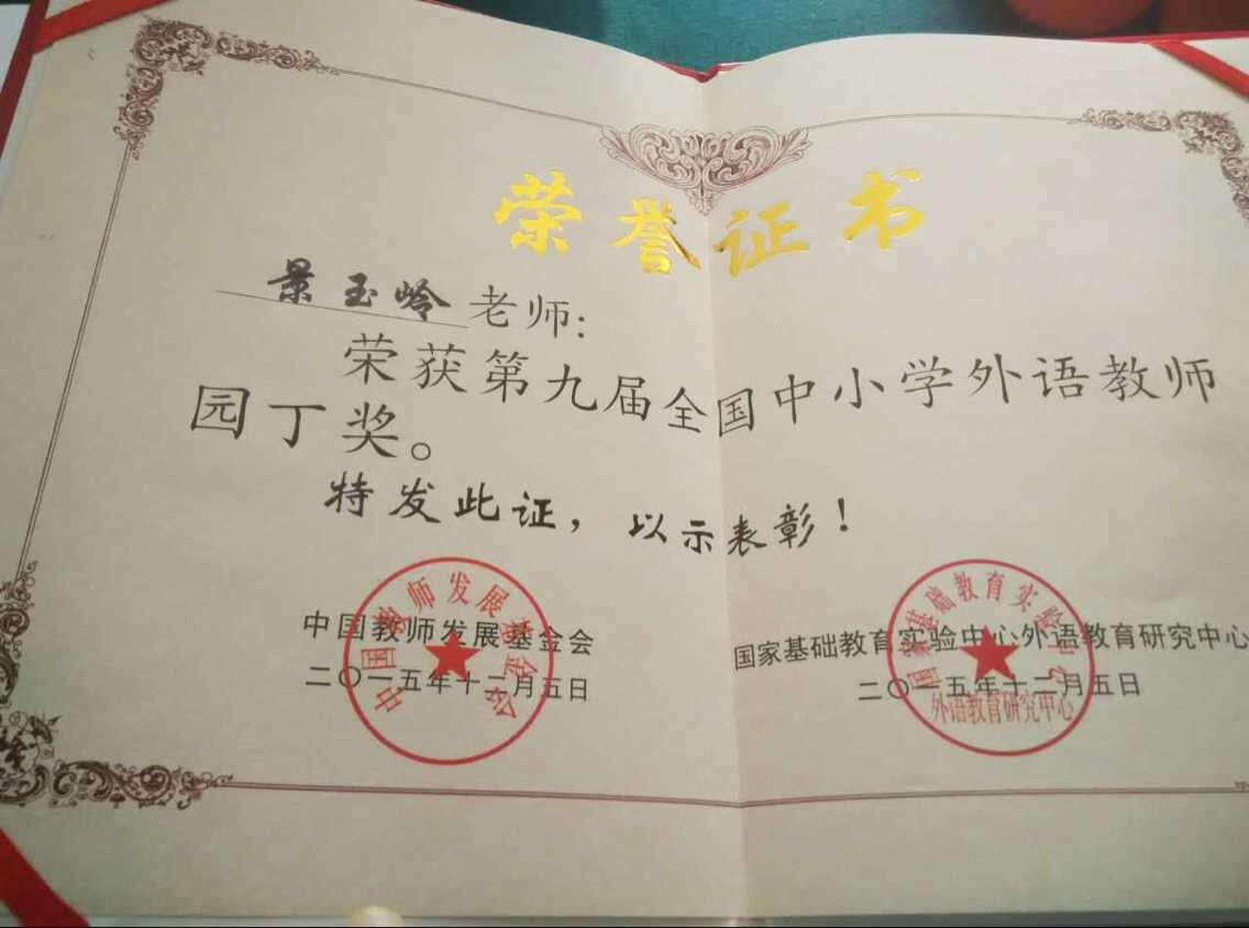 近日,第九届全国中小学外语教师园丁奖暨全国三“十佳”外语教师评选结果揭晓。我校景玉岭老师喜获第九届全国中小学外语教师园丁奖,是济南市初中英语学段唯一获此殊荣的教师。全国中小学外语教师园丁奖是全国性基础教育外语教学单科奖于1993年由原国家教委有关部门批准设立,每两年评选一次,是我国基础教育界迄今为止唯一一项专门针对外语科所设的最高奖项。本奖项长期设立,奖励对象为全国优秀中小学外语教师和教研员。