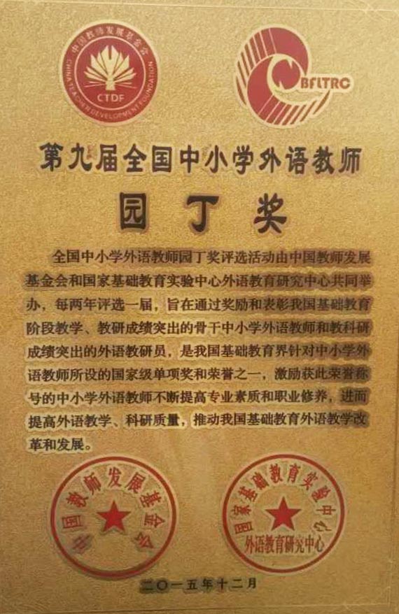 全国中小学外语教师园丁奖到目前为止已评选了九届。园丁奖表彰了全国三十省(自治区、直辖市)的优秀中小学外语教师和教研员。第九届全国中小学外语教师园丁奖于2015年在全国各地教育行政部门,教研部门的积极努力和大力支持下,根据第九届全国中小学外语教师园丁奖的评选细则和办法,进行了认真、细致的评选。每位第九届全国中小学外语教师园丁奖获得者得到了由中小幼教师奖励基金会同国家基础教育实验中心外语教育研究中心颁发特制金制奖章、奖牌、获奖证书和图书等。