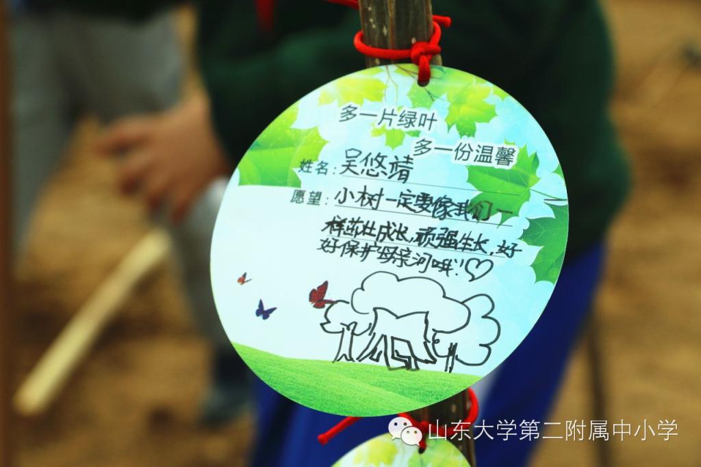 孩子们都希望自己的小树苗能够健康茁壮的成长,因此他们都准备了心愿卡,在一张张心愿卡上写下他们的愿望,挂在亲手栽下的树苗上,“亲爱的小树,你一定要像我们一样,茁壮成长,顽强生长,好好保护母亲河吆!”