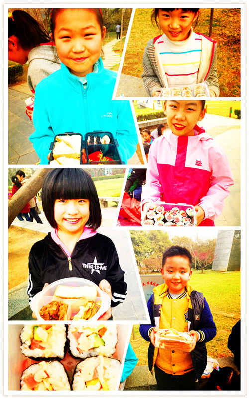 几轮游戏过后,孩子们终于是玩累了,午餐时光开始啦,孩子们拿出带来的食物,与小伙伴们一起分享。瞧,有寿司、有三明治、有水果沙拉、有烤制的小蛋糕。但令你更想不到的是这些食物竟然是这群三四年级的孩子自己做的,他们将自己的得意之作递给张老师品尝,其实这时的张老师已经吃得饱饱的了,可是孩子们亲手做的东西,又怎能不尝一尝,不给孩子们点个大大的赞呢!孩子们是多希望老师能吃到自己做的东西啊!